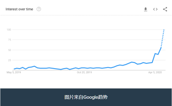 如上图所示,该词的搜索量似乎在4月初开始变成抛物线形,并且没有迹象表明随着事件的快速发展而放慢速度。