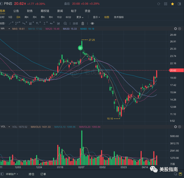 4、**关注PINS人数: 4633, 人气是在美国4大社交股里面偏弱的, 当然我觉得认为 PINS 其实偏向图片工具 + 部分的电商, 社交的成分相比Facebook、Twitter、SNAP 还是偏弱的。