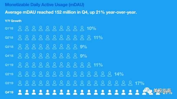 3、4月21号的Q1财报显示: DAU为2.29亿,同比增长20%, 营收4.62亿美元(同比增44%), 亮点: 广告收入仍然正向增长