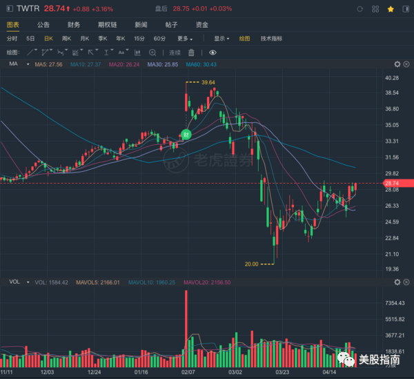 3、财报日期: 2020年4月30号盘前, Twitter预计营收在8.25亿-8.85亿美元,预期为8.73亿美元; 根据eMarketer对Twitter第一季度的分析,该公司3月份的收入将下降9%至40%。