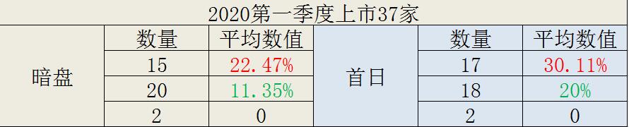 2020年一季度上市37家,其中15家暗盘平均涨幅22.47%,20家暗盘平均跌幅11.35%,2家暗盘平盘;17家首日平均涨幅30.11%,18家平均跌幅20%,2家平盘。
