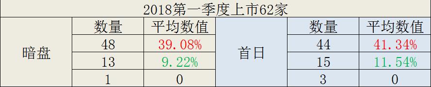2018年一季度上市62家,其中48家暗盘平均涨幅39.09%,13家暗盘平均跌幅9.22%,1家暗盘平盘;44家首日平均涨幅41.34%,15家平均跌幅11.54%,3家平盘。