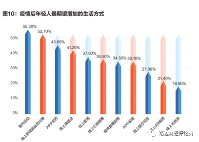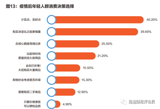 报告还显示,40.2%的人在疫情后倾向于“少买点,买好点”,39.6%的人认为“购买决定比之前更慎重”,还有25.5%的人“总担心(分期、信用卡)额度用的太多”。,45.6%的年轻人倾向于购买“绿色环保产品”,42.4%的年轻人愿意选择“具备多功能用途的产品”。“品质”、“慎重”、“额度控制”,这些选择充分说明,年轻人消费更偏于“理性”。