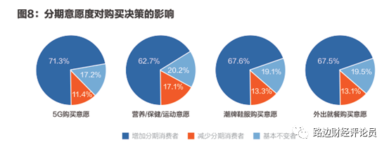 报告显示,当一个用户计划增加分期消费时,其购买5G手机的意愿会提升7倍,购买潮牌鞋服的意愿提升5倍,购买营养、保健、运动类的意愿提升3.6倍。