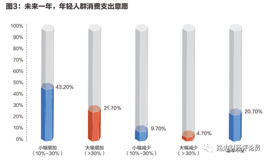 在支出方面,报告显示,未来一年,计划小幅增加消费支出的年轻人占比达43.2%,环比3月提高11个百分点;计划大幅增加消费支出的人占比达到21.7%,环比3月提高8个百分点,这两项占比近65%,环比3月提高19个百分点,而表示会缩减消费支出的人数,占比不到15%,其中大幅减少开支(超过30%)者占比仅4.7%,环比3月大幅降低22 个百分点。