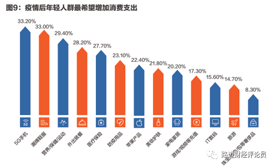 而报告结果显示,近期有超过1/3的年轻消费者对于消费升级的重点品类关注度上升。5G手机是品质消费的代表,如今已成为疫情后年轻人最希望增加支出的消费类别,意愿购买者达到33.2%,4月比3月同期提高了17个百分点。除了5G,潮牌鞋服、运动保健和外出就餐等等都是年轻人最想增加的消费支出类型。
