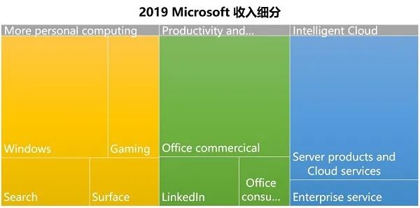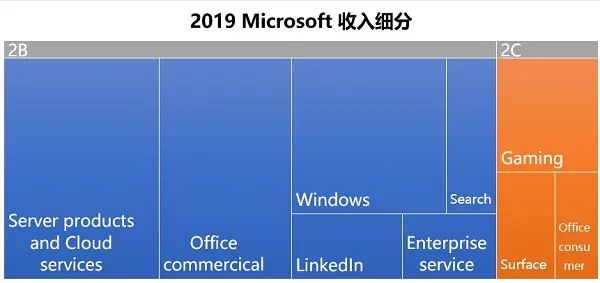 通常作为一个消费者而言,我们更多关注的是一家公司2C的业务,因为我们为此“直接”付钱。但是微软从业务细分来看,主要面对的还是2B的市场,也就是对企业的业务。包括微软的三级马车——服务器和云、Office 2B,Windows OEM。这可能也是为什么微软虽然在智能手机时代没能赶上苹果和谷歌,但是总体业务却异常强劲的一个重要原因。