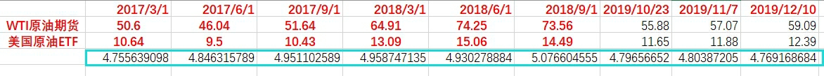 $美国原油ETF(USO)$都说损耗大,我用wti原油期货和美国原油etf做比值后大概在4.8左右波动,图片了2017-2018取的3、6、9月底值,2019和2020取的是标注的日期。$优信(UXIN)$$WTI原油主连(CLmain)$$蔚来(NIO)$$波音(BA)$$特斯拉(TSLA)$