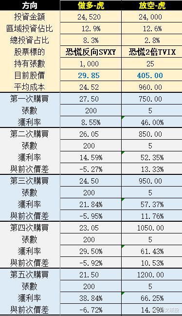 到下图价位我会进行$0.5倍做空波动率指数短期期货ETF(SVXY)$ 做多和$二倍做多VIX波动率指数短期期权ETN(TVIX)$ 做空,目前手上是TVIX做多持有30张(成本349),近期我认为还有高点,要留意和始主的差异,目前价位在65.54距离这次高点85.47,大概还有30%的空间,但我不认为TVIX会再破1000元的价位,不过放空记划还是要抓大一点,不要过度自信某个价位…