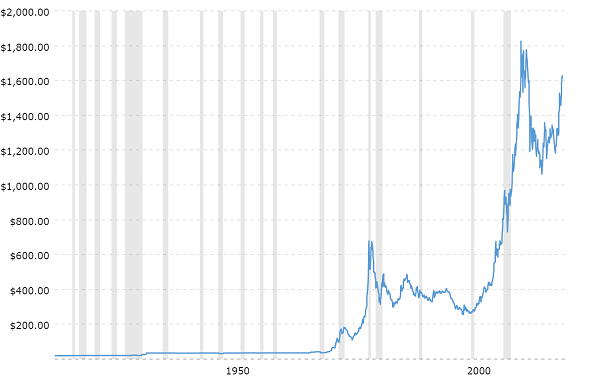 上图是黄金过去100年的价格(美元)。1971年8月15日,美国总统尼克松宣布美元停兑黄金,布雷顿森林体系崩溃。美元从此和黄金脱钩,从35美元/盎司持续贬值到今天的1600多美金/盎司。算一下年化回报率也超过了8%。而同期道琼斯工业指数的年复合回报率还不如黄金,只有7.4%。