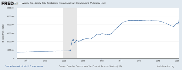 3月26日,美国国会通过了2万亿美元的救市计划,这钱哪里来?只能是美国的央行——美联储。2008年金融危机以来,经过多次地量化宽松,美联储的资产负债表已经超过4万亿,虽然2018年到2019年一度降低,但是新冠疫情让美联储不得不再次放量宽松。