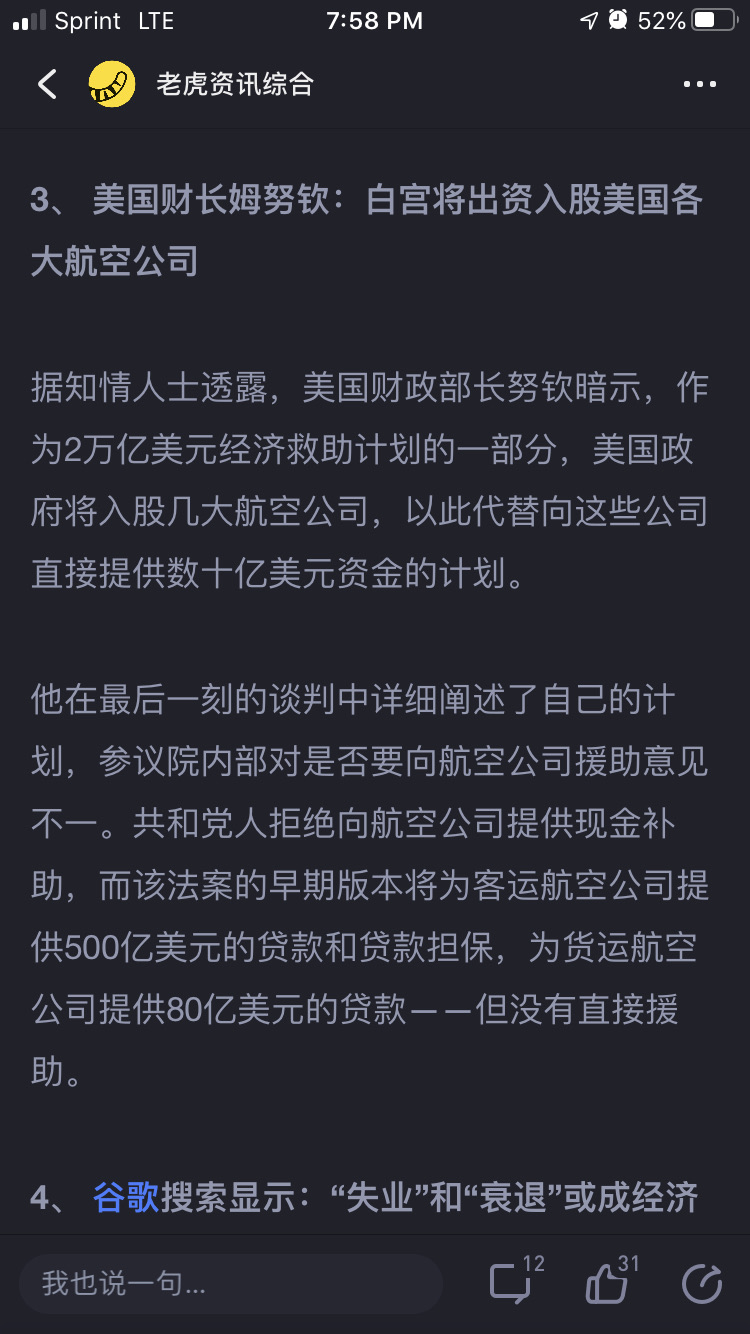 据知情人士透露,美国财政部长努钦暗示,作为2万亿美元经济救助计划的一部分,美国政府将入股几大航空公司,以此代替向这些公司直接提供数十亿美元资金的计划。