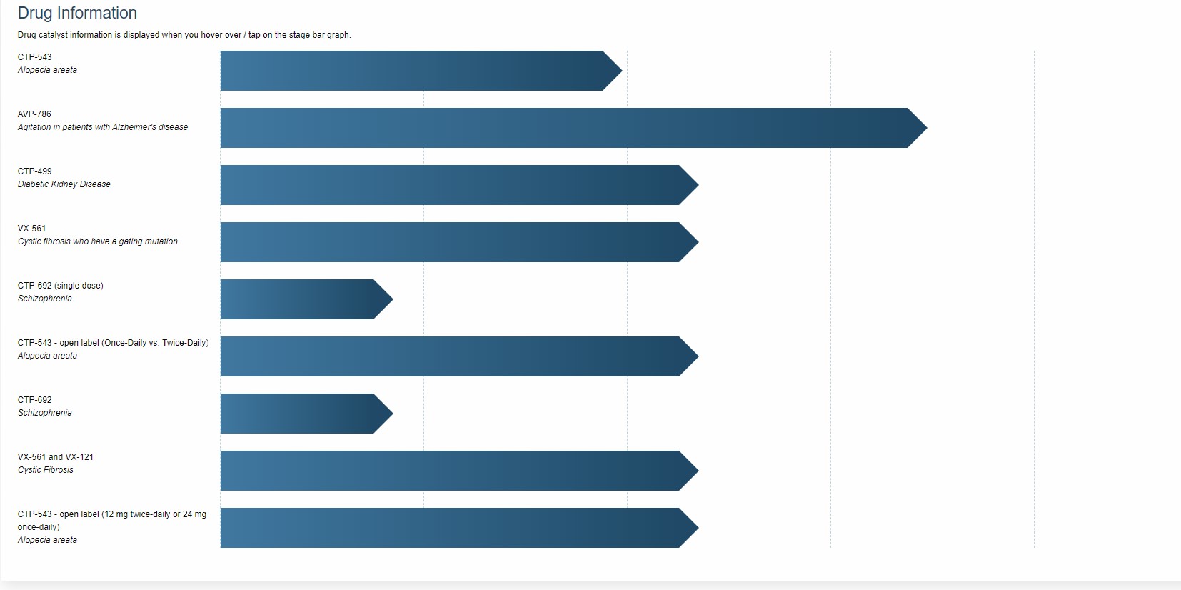 9月初更新过II期数据数据不错(Sep 3, 2019、8:30 AM EDT、CTP-543 Phase 2 Results),股价应声而起30%,但架不住主要管线AVP-786的彻底垮塌。股价跌去接近50%.