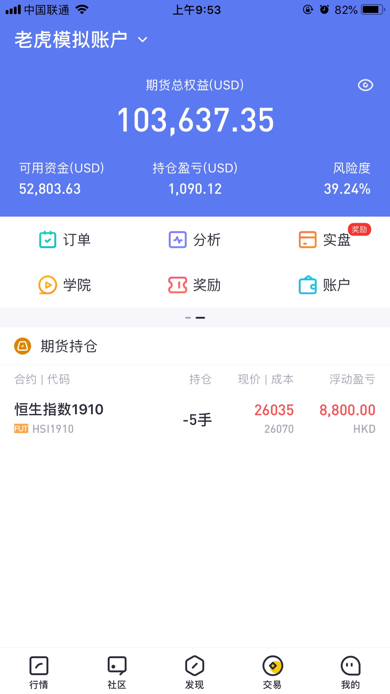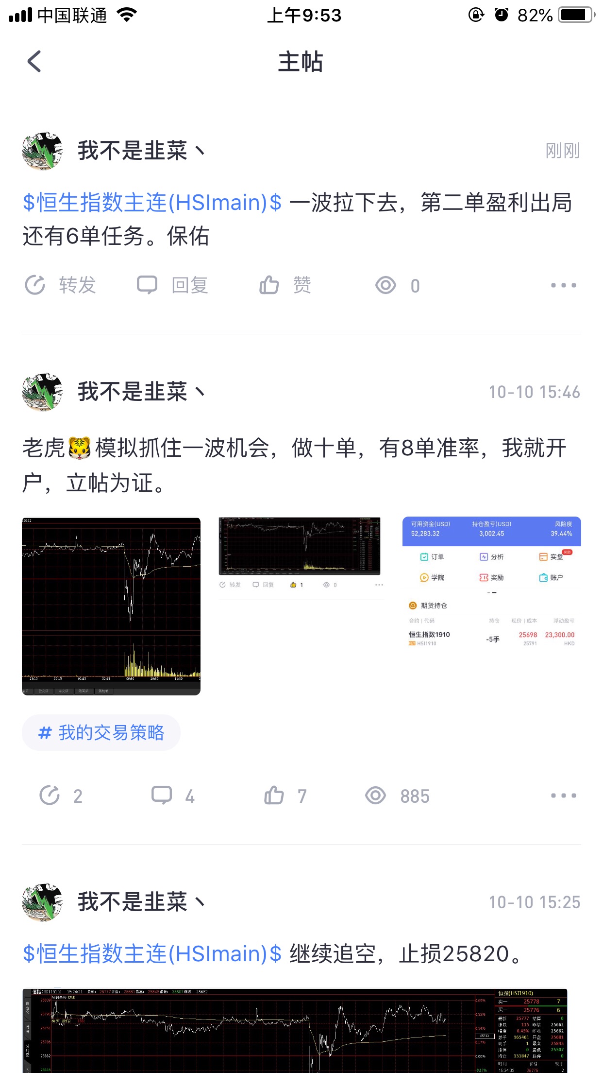 第二单,老虎模拟及时平仓获利,恒指波动浮动大,小心脏受不了,哦,这是模拟号!!静等下一个趋势。