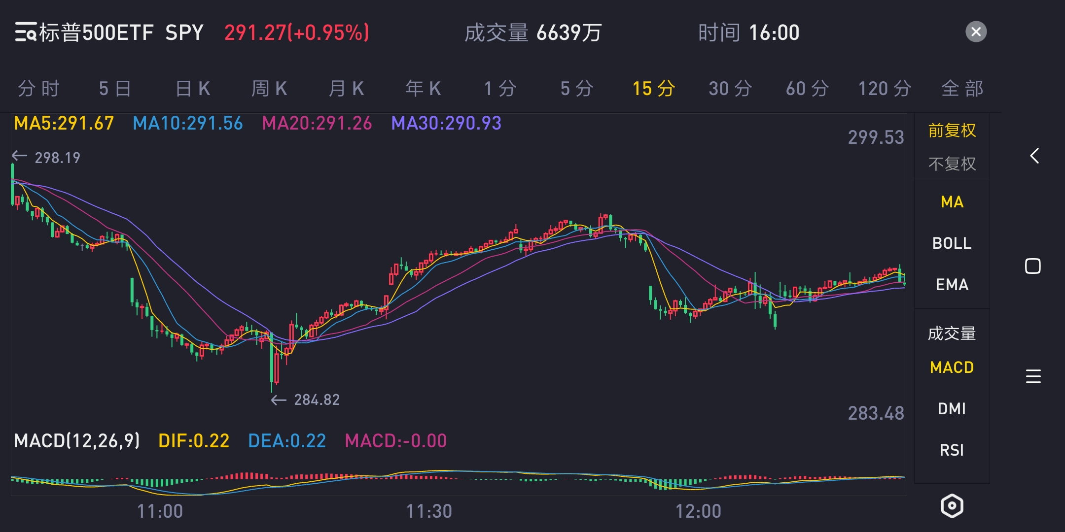 看看昨天的走势跟前几天下跌到284.82反弹的走势是不是很像,看macd,均线。只不过昨夜的反弹更弱一些而已。从更大的周期看,近期的波动都是正常走势,不猜顶,不猜底,走一步看一步,用一句股市里的废话来讲就是,明天K线怎么走?答曰,向右走,具体怎么走?答曰,后天就清楚了。从历史的K线里找出一点自己看的懂的东西就不错了。