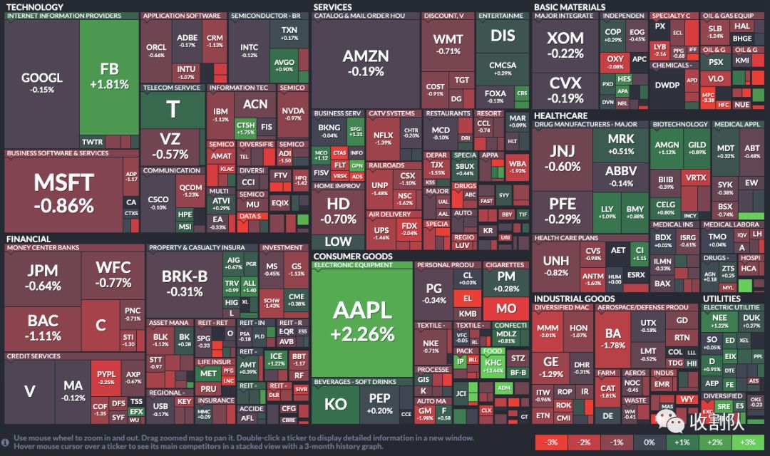 起因是这样:复盘的时候发现纳指100ETF QQQ $纳指ETF(QQQ)$ 收涨0.01%,但是其4个重要的子板块:FDN $First Trust Dow Jones Internet I(FDN)$ 、IGV $iShares North American Tech-Software ETF(IGV)$ 、SMH $半导体指数ETF-HOLDRs(SMH)$ 、IBB $生物科技指数ETF-iShares Nasdaq(IBB)$ 全部收跌,虽说QQQ里面苹果 $苹果(AAPL)$ 和Facebook $Facebook(FB)$ 收涨而且权重比较高,但是纳指最终能收涨也未免太夸张了一点,因为大部分成分股是跌的,下图是标普500 $SP500指数主连(ESmain)$ $标普500ETF(SPY)$ 的昨日涨跌幅情况,可以看到除了部分医药股和AAPL、FB外,大部分是跌的: