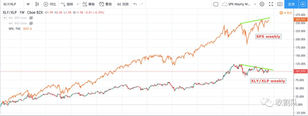 其次,XLY $消费品指数ETF-SPDR可选消费品(XLY)$ 的周线强度一直弱于XLP $消费品指数ETF-SPDR主要消费品(XLP)$ ,但是标普500和纳指还在创新高,产生了比较明显的背离。