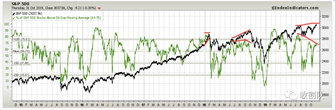 上图是标普500指数(黑色线)与50日均线以上股票比例(绿色线,即市场深度)对比图,首先观察几个历史节点: