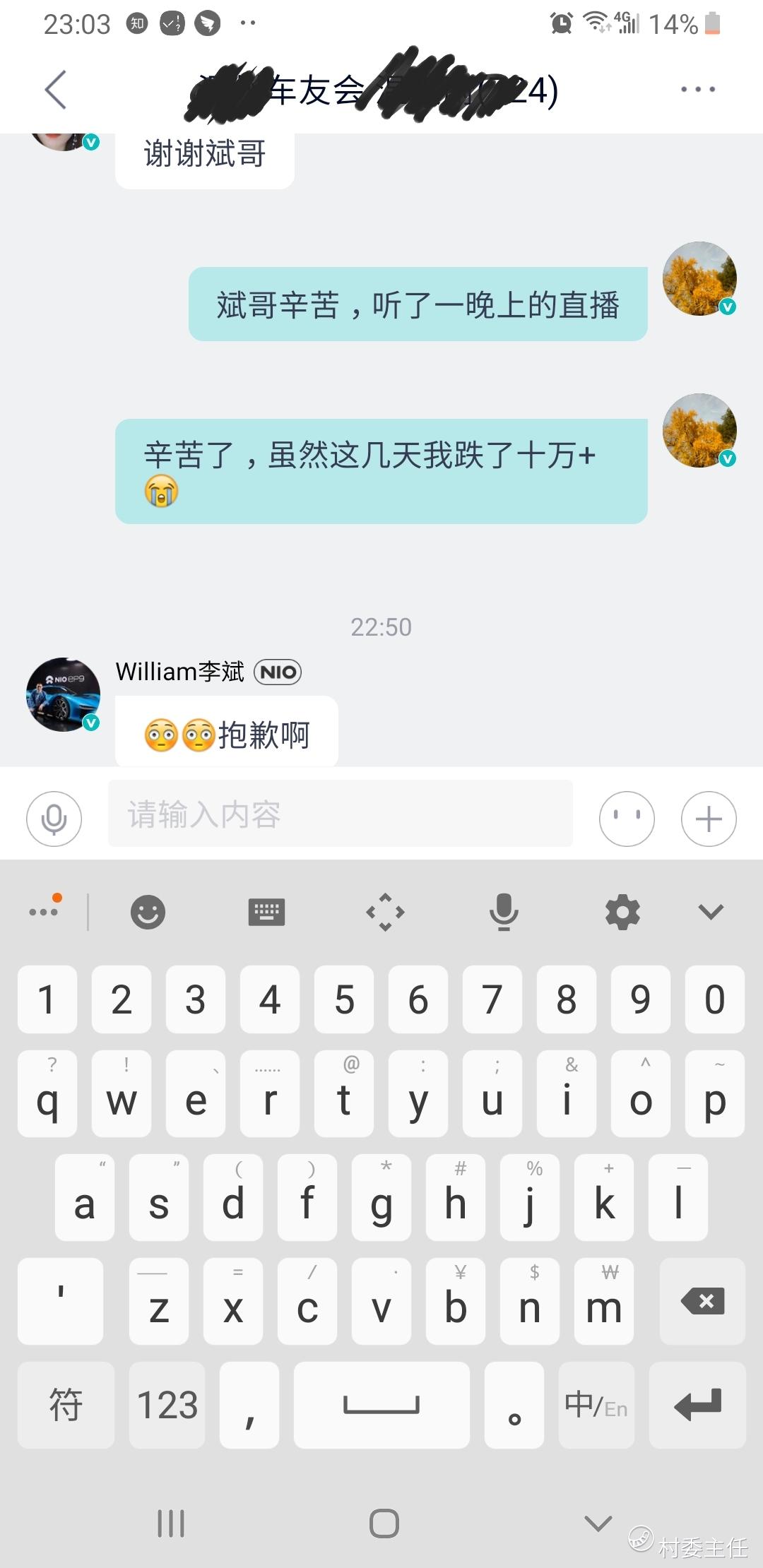 刚在车主群里,随便提了下,很感动,李斌立刻道歉了,在数百人的群里。