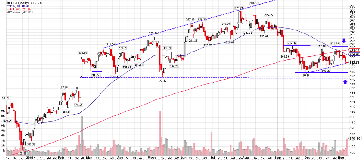 市场总有理由,不如看看技术图形。TTD整体上在一个大的三角形区间内运动,年度下沿是18年四季报的低点173.5。