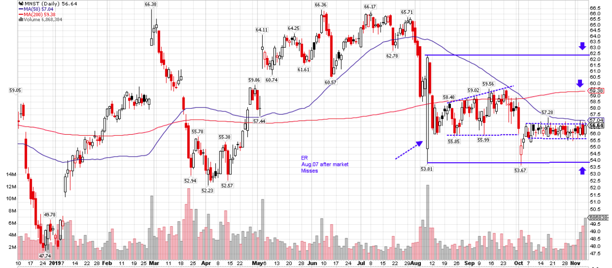 如上方MNST日线图,先看看历史,8月7日盘后其公布19年Q2财报,不及预期,盘后暴跌11%至53.52,但是8月8日开盘形成了一根巨大阳线,从暴跌的低位回升到62.18收盘,当日振幅达15.9%,估计空头多头都傻眼,其后1个季度,基本上就在这根大K线的范围内震荡(虚线箭头所指)。