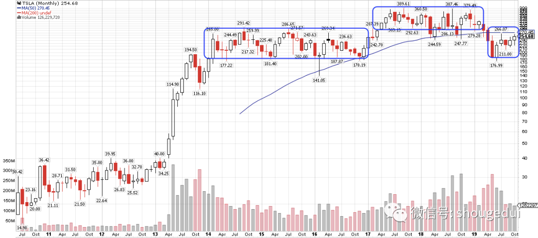 阶段1 -> TSLA 从14年到17年3年间一直在$180-$290区间盘整,区间高度约$110