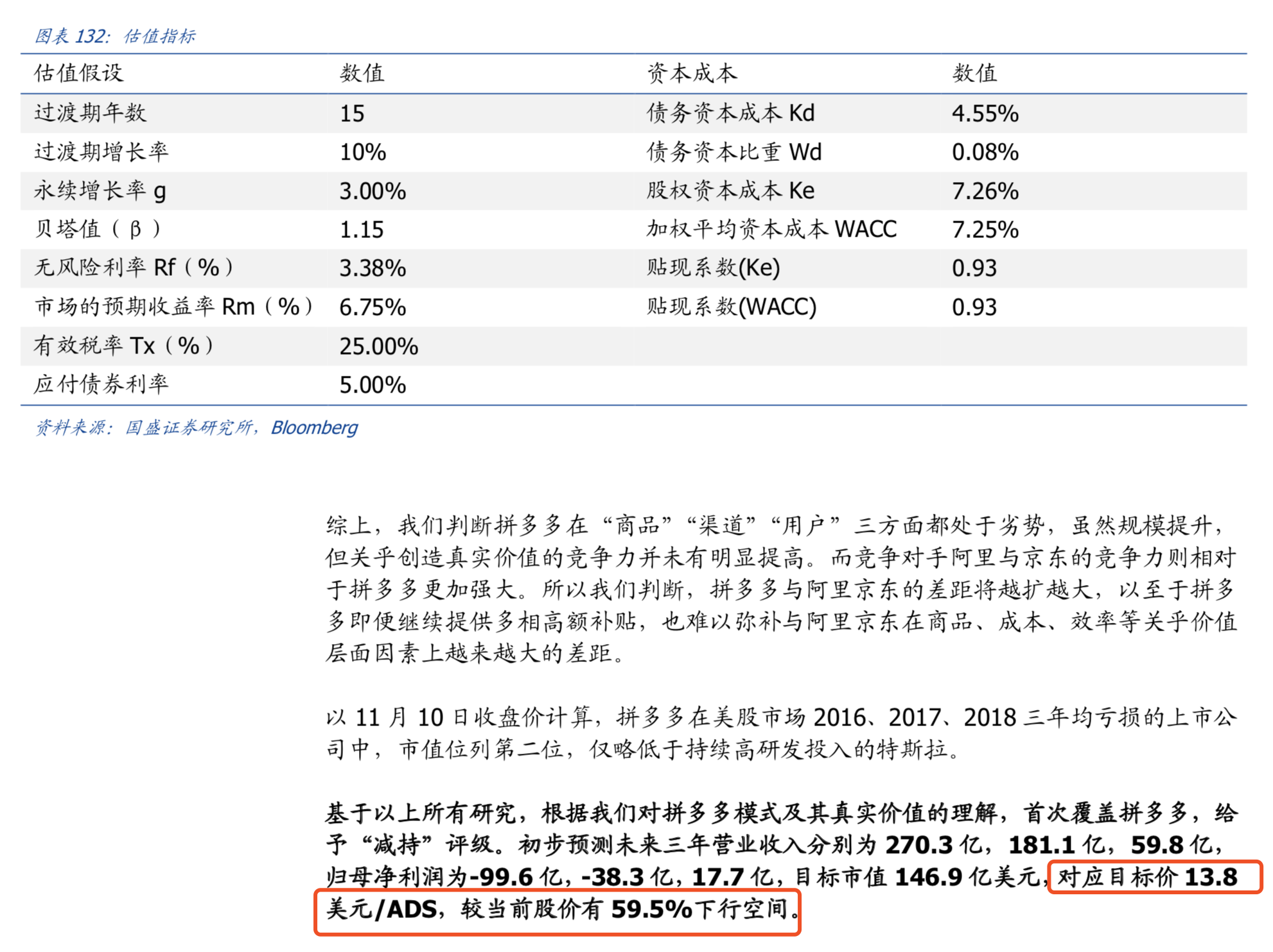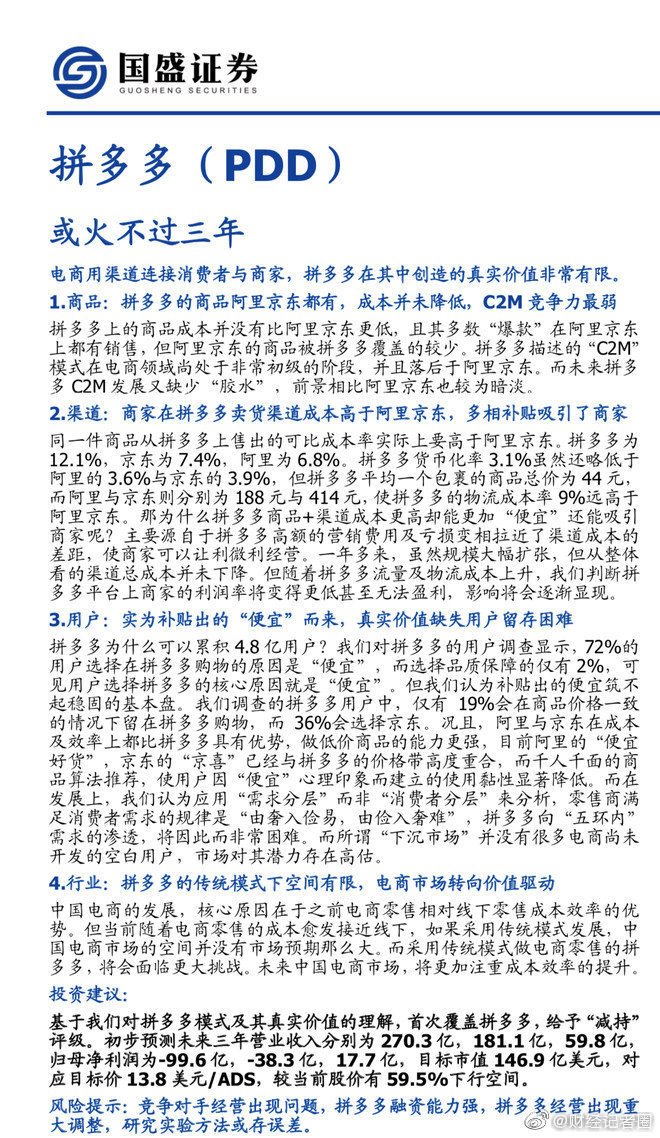 国盛证券发布研究报告称“拼多多或火不过三年” 里面有一些和京东阿里的数据对比