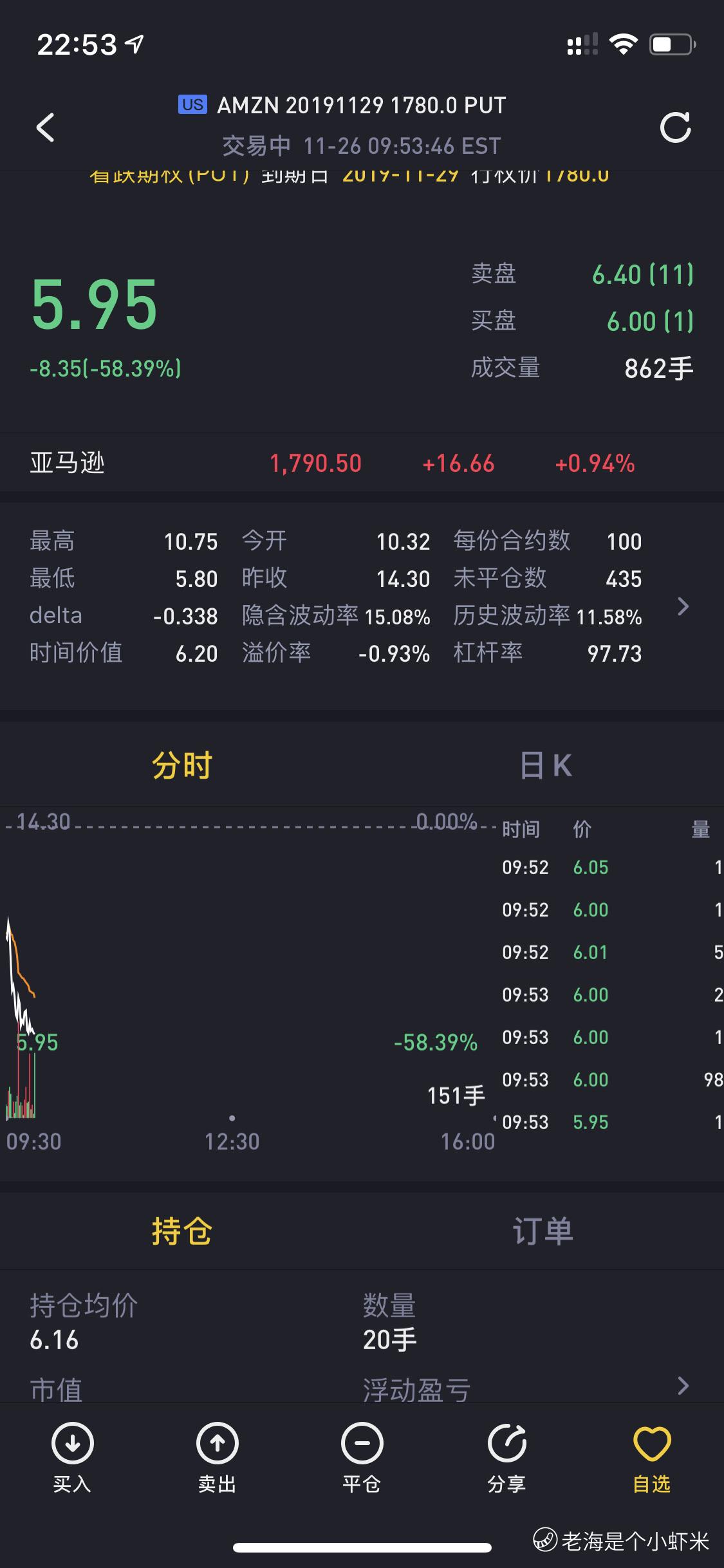 6.16入了20手亚马逊的put,做个日内!