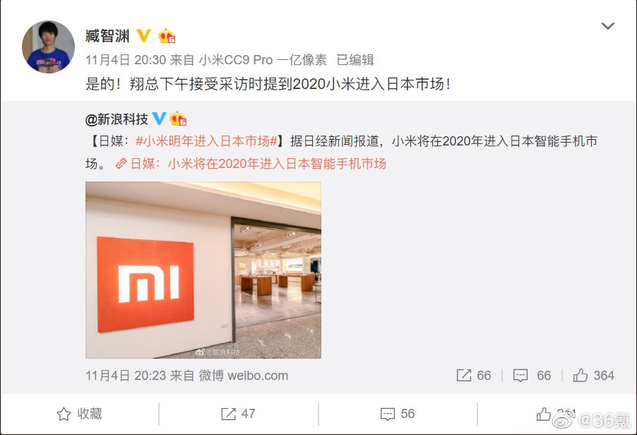 此前,据日经新闻报道,小米将在2020年进入日本智能手机市场;随后小米手机产品市场总监臧智渊转发微博,确认消息属实(图2)。今天,小米官方正式宣布即将进入日本市场,但尚未明确在日本将要发布的产品。
