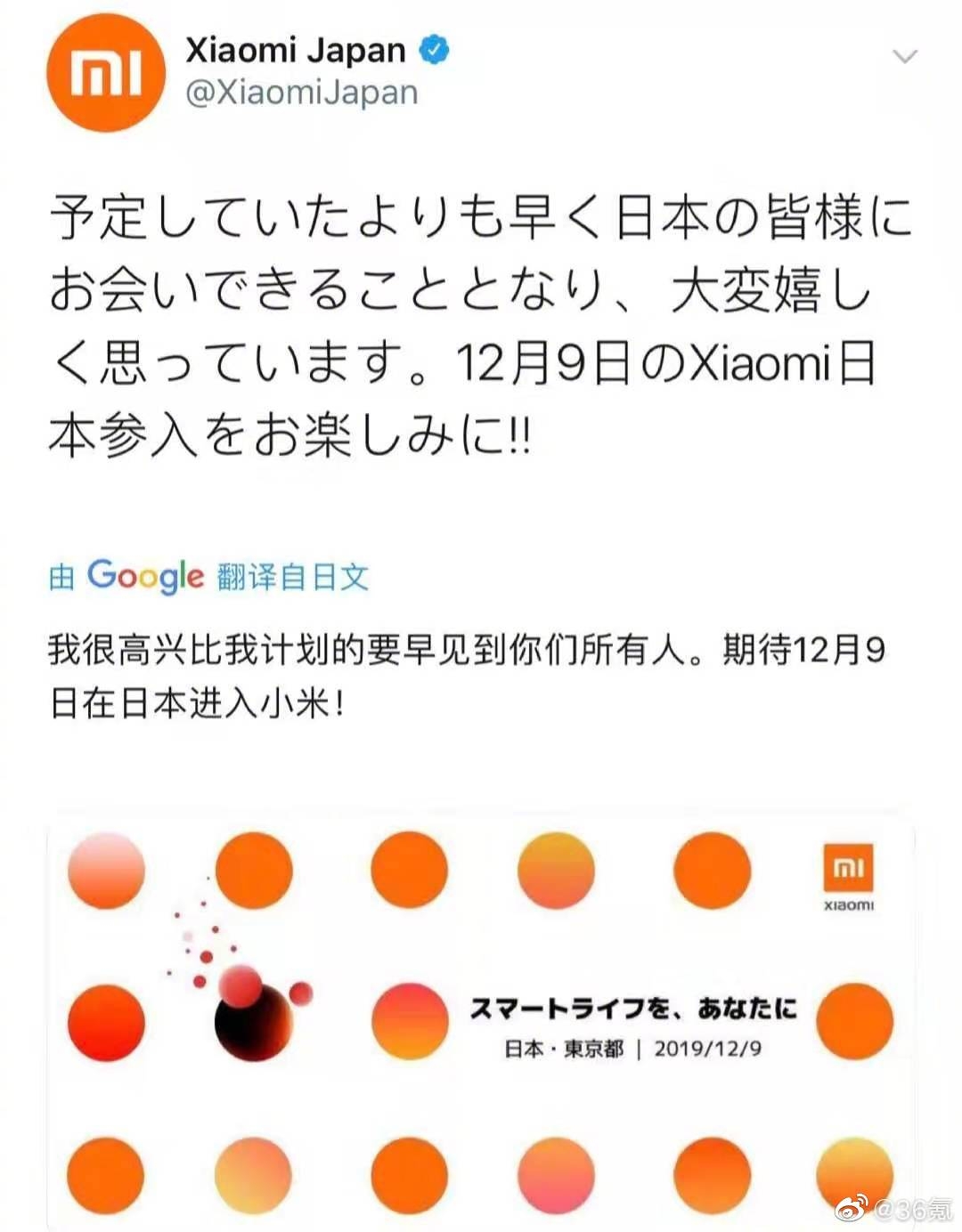36氪获悉,小米日本官方推特宣布,将于12月9日进入日本市场,并举行首场发布会(图1)。早在2018年,小米就已经与日本最大移动运营商NTT Docomo达成一项全球授权协议,该协议涵盖了NTT的标准必要无线专利,而此举很可能就是为进军日本手机市场做准备。