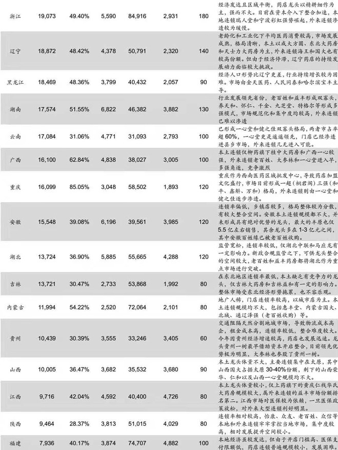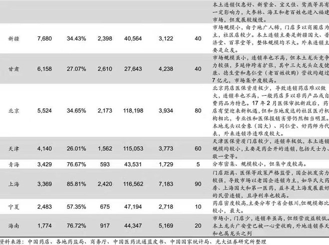 我们看到不同省份现有的人口数量、人均收入、药店市场规模、门店数、竞争对手、市场集中度等条件对于一个药店的价值形成直接影响。大参林深耕大湾区,益丰药房深耕长三角,老百姓全国都有布局,一心堂深耕大西南等地。从区位上看,深耕发达地区的益丰和大参林竞争力最强,这也是他们单店估值较高的原因,所以我觉得中国的药店行业还处在跑马圈地的时代,未来很可能是一个诸侯割据的情况,很长一段时间都不会出现一家独大。