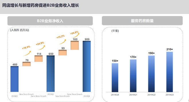第三季度,111集团核心板块B2B业务继续保持高涨势头,服务药店的规模进一步扩大到21万家,同比增长61.5%,业务营收9.09亿元,同比增长229.5%。