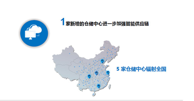 全国有5个仓,华北是在天津,华东是昆山,华南在广州,华西是重庆,武汉是华中,华中运营中心是今年新增设的,基本覆盖300多个城市,23个省份24小时送达。