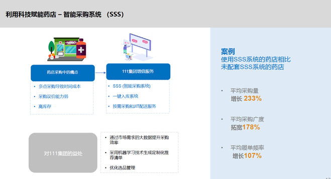 在比如针对药店来说,上线了智能采购系统,店主可以方便进行比价、仓库管理,还可以利用附近地区的销售大数据合理备货增加流动性,采用机器学习的好处是一家小药店也可以管理几十万的品类,实现了经营管理的赋能,提高了效率,降低成成本。据内部数据,用其自主开发的智能采购系统单店平均的采购量是增长233%,采购的广度,就是SKU的种类增加了178%,复购增长107%,效果非常好。