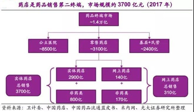 三个二八定律讲完,继续谈卖药这个行业,由于中国长期实行以药补医机制,医院是药品主流消费渠道(第一终端),药店是第二终端,占全国1.4万亿药品终端销售的22%左右(2017年)。2017年,零售药店中,实体药店市场规模约3700亿,药品占比约80%;医药电商总规模约310亿,药品占比约45%。