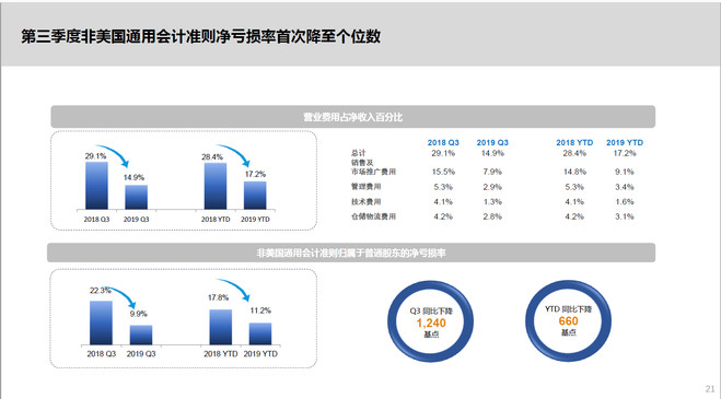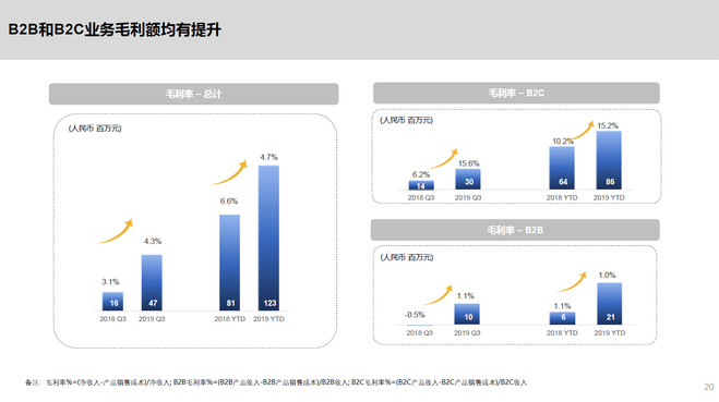 大规模自主开发的智能化管理系统的应用,让公司整体运营效率大幅提升,成本继续下降。三季度,集团经营费用占净收入比重从去年同期的29.1%下降至14.9%。仓储物流费用占净收入比重从去年同期的4.2%下降到本季度的2.8%。