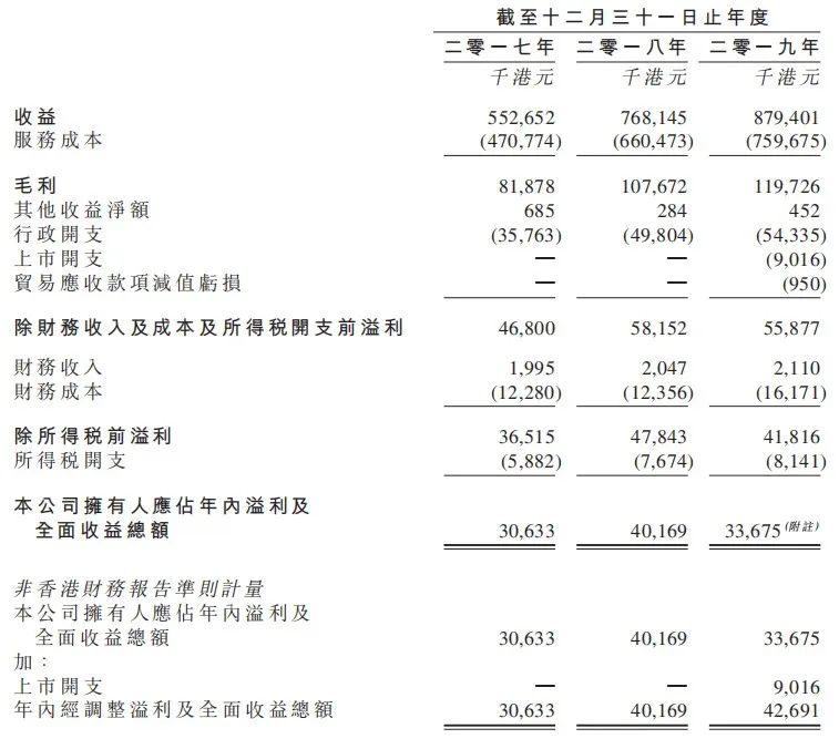 主要业务近年来保持稳定高速增长:2017年度营收5.5亿港元,毛利8200万港元;2018年度营收7.7亿港元,毛利1.08亿港元;2019年度营收8.8亿港元,毛利1.2亿港元。
