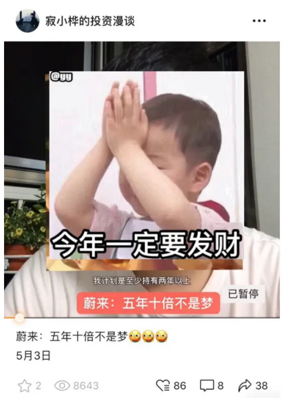 五月三号我在视频号上面跟大家分享了买入蔚来汽车,长期锁仓看到五年十倍,万万没想到,不到三个月时间我持有的蔚来汽车股票就实现了五倍浮盈,再翻一倍我就能提前实现我五年十倍的目标了。