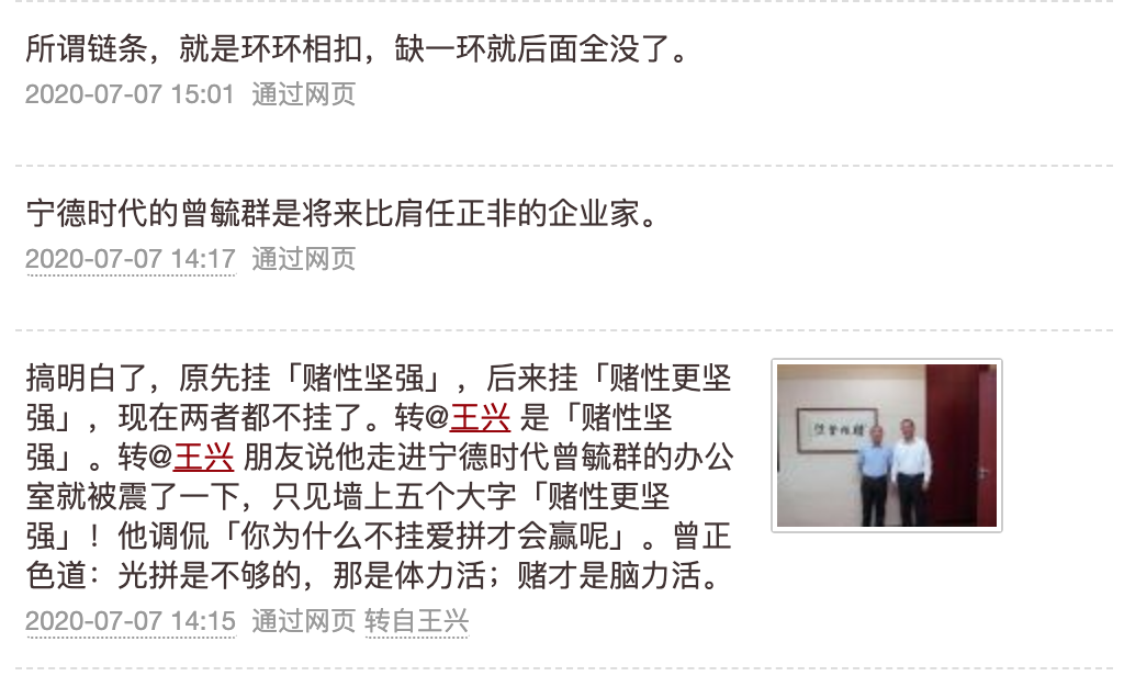 说到智能汽车,电池是非常关键的部件,王兴也多次提到宁德时代及其创始人。