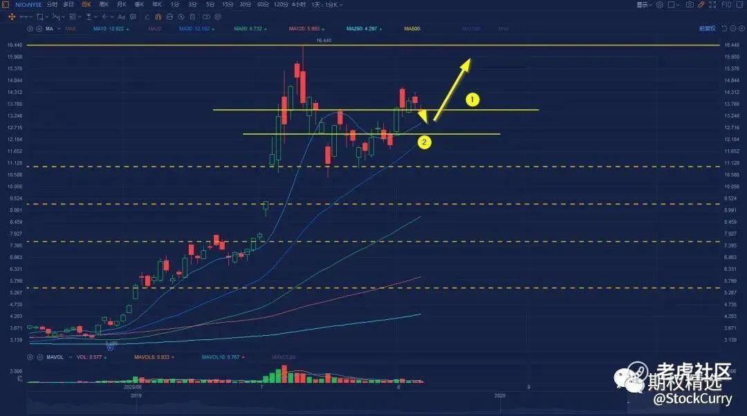 短期来看之前最高冲到了16.4.我记得很清楚,那是传闻有融资的时候,7/10号实锤,股价高开低走,在接下来的几天里一直跌到了11块左右。从那以后整个股票走了一个W型,那么在8/3号也是突破了W的颈线,最近几天有一些回调的表现。如果从图形上来看,蔚来我还是看涨,因为突破了W,大概走势为下图。蔚来有两个很强的支撑位,一个就是圈1,13.52附近,也就是颈线,另一个是圈2,12.43附近,现在持仓的同学可以参考一下,如果股价突破圈1那可以加仓。如果没有突破而是继续向下走那可以跌破圈2处可以止损。