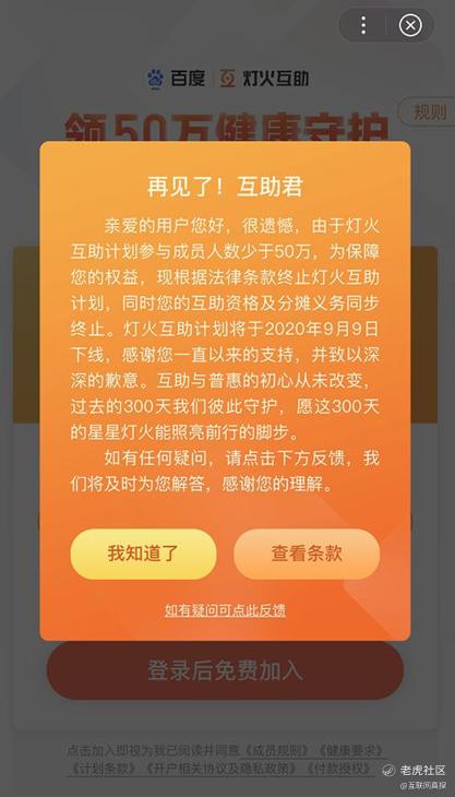 日前,百度$百度(BIDU)$ 的网络互助产品“灯火互助”发布公告:由于参与成员人数少于50万,为保障用户权益,将依法终止灯火互助计划,并于9月9日下线。