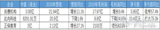 2019年达内科技实现营收20.5亿元同比下降1.6%毛利润8.8亿元同比下降24.85%净亏损10.4亿元同比扩大75.3%达内科技去年年末被曝出因拖欠年报收纳斯达克退市警告函随后自曝在财务审计中发现2014-2018财年内多报约9亿元营收2020年开年达内先后公告CFO离职CEO变动无独有偶正保远程也面临着盈利承压2019年其全年营收达2.12亿美元同比增长27.1%但当年营销费用达6100万美元同比增长37.44%营销费用增速超过营收增速净利润则一降再降尽管2019年回升至2100万美元但仍未达到之前的水准