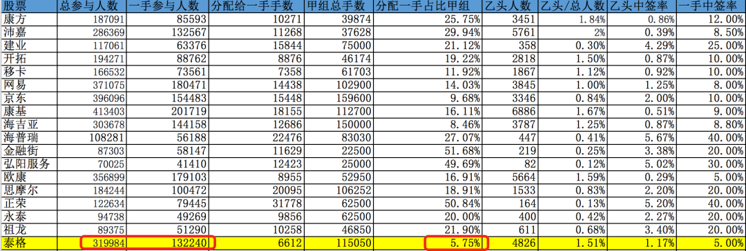 这次泰格的分配昨天文章也写了,应该是最不利一手党的一次了,只给一手分了5.75%的甲组货源,所以可以看到很多一户现金参与的人,全灭,甚至十几个全不中也都正常,另外我们从图上也可以看到一个变化,一手参与的比例在下降,从之前一般的50%+,降低到了这次132240/319984=41.33%,当然之前京东那次1手参与的比例也比较低,这个会不会形成趋势还有待观察。