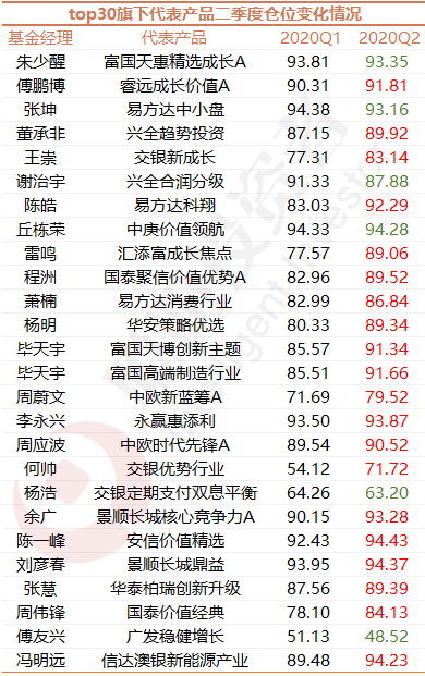 从TOP30基金经理的二季报来看,多数对市场保持比较积极的态度,因此TOP30基金经理旗下的产品整体上也是加仓的。