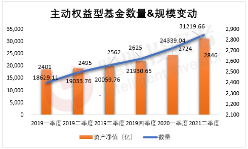 今年二季度,主动权益类基金的规模和个数创了新高,总数达到2846只,相比去年四季度增加112只,规模暴增6880亿,目前总规模已达3.12万亿。