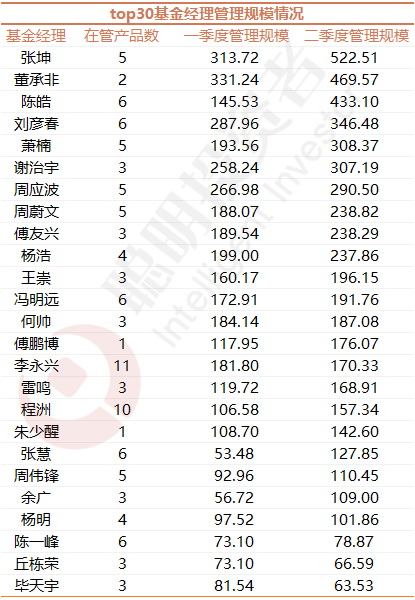 1、聪明投资者统计了TOP30基金经理一季度和二季度的管理规模情况,目前来看,管理规模最大的是张坤,总管理规模超500亿,相比一季度,二季度管理规模增加了200多亿,除了他在二季度新发了一只近80亿的基金,张坤旗下老基金净值和份额的增加,也为规模增长做出了贡献。