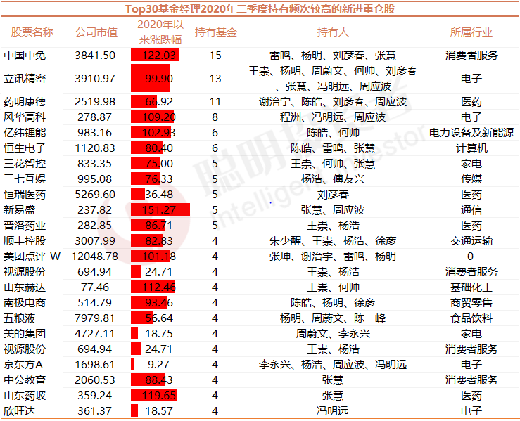 聪明投资者根据基金持有数,对TOP30基金经理旗下基金二季度新进、增持重仓股进行了统计。