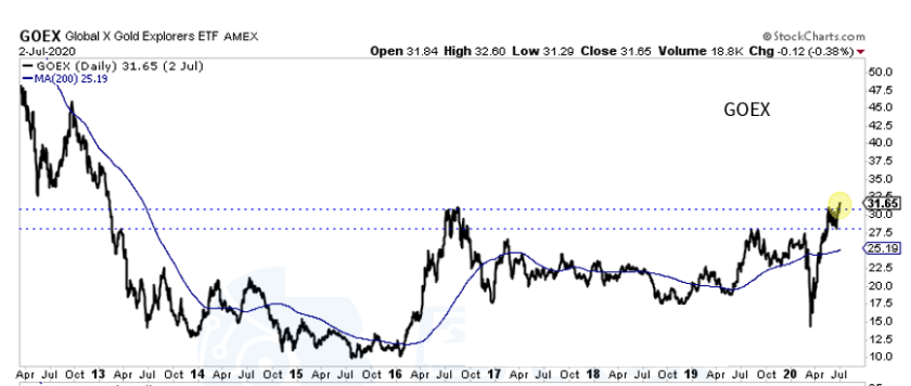 但是,初级矿业股行业已经出现向上破位。GDXJ 和GOEX 都突破了7年阻力,形成了新的日线和周线高点。最近几天,大型矿业股表现落后。