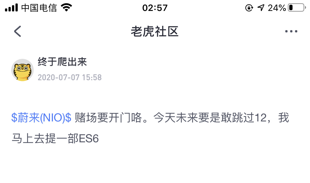 {"i18n":{"language":"zh_CN"},"detailType":1,"isChannel":false,"data":{"magic":2,"id":949388408,"tweetId":"949388408","gmtCreate":1594148358204,"gmtModify":1704204163509,"author":{"id":3548243647160644,"idStr":"3548243647160644","authorId":3548243647160644,"authorIdStr":"3548243647160644","name":"终于爬出来","avatar":"https://static.tigerbbs.com/f02507bf20fd995bde7b219f02171b94","vip":1,"userType":1,"introduction":"","boolIsFan":false,"boolIsHead":false,"crmLevel":2,"crmLevelSwitch":0,"individualDisplayBadges":[],"fanSize":59,"starInvestorFlag":false},"themes":[],"images":[{"img":"https://static.tigerbbs.com/e4d6a05404d43381c04343c83902eb50","width":"1242","height":"737"}],"coverImages":[{"img":"https://static.tigerbbs.com/e4d6a05404d43381c04343c83902eb50","width":"1242","height":"737"}],"extraTitle":"","html":"<html><head></head><body><p><a href=\"https://laohu8.com/S/NIO\">$蔚来(NIO)$</a>睡了一觉起来。打开app的时间想如果跌跌厉害就买call去。结果?????</p><p>这是要还愿去么?</p><img src=\"https://static.tigerbbs.com/e4d6a05404d43381c04343c83902eb50\" tg-width=\"1242\" tg-height=\"737\"></body></html>","htmlText":"<html><head></head><body><p><a href=\"https://laohu8.com/S/NIO\">$蔚来(NIO)$</a>睡了一觉起来。打开app的时间想如果跌跌厉害就买call去。结果?????</p><p>这是要还愿去么?</p><img src=\"https://static.tigerbbs.com/e4d6a05404d43381c04343c83902eb50\" tg-width=\"1242\" tg-height=\"737\"></body></html>","text":"$蔚来(NIO)$睡了一觉起来。打开app的时间想如果跌跌厉害就买call去。结果????? 这是要还愿去么?","highlighted":2,"essential":1,"paper":1,"likeSize":13,"commentSize":12,"repostSize":0,"favoriteSize":0,"link":"https://laohu8.com/post/949388408","repostId":0,"isVote":1,"tweetType":1,"viewCount":3516,"commentLimit":10,"likeStatus":false,"favoriteStatus":false,"reportStatus":false,"symbols":["NIO"],"verified":2,"subType":0,"readableState":1,"langContent":"CN","currentLanguage":"CN","warmUpFlag":false,"orderFlag":false,"shareable":true,"causeOfNotShareable":"","featuresForAnalytics":[],"commentAndTweetFlag":false,"andRepostAutoSelectedFlag":false,"upFlag":false,"length":86,"xxTargetLangEnum":"ZH_CN"},"commentList":[{"id":2615475,"commentId":"2615475","gmtCreate":1594149086757,"gmtModify":1594149086757,"authorId":3539726700187882,"author":{"id":3539726700187882,"idStr":"3539726700187882","authorId":3539726700187882,"name":"發發大家發","avatar":"https://static.laohu8.com/default-avatar.jpg","vip":1,"crmLevel":1,"crmLevelSwitch":0,"individualDisplayBadges":[]},"repliedAuthorId":0,"objectId":949388408,"objectIdStr":"949388408","type":1,"supId":0,"supIdStr":"0","prevId":0,"prevIdStr":"0","content":"恭喜老板喜提es6,真是好车。我用es8两年了。","text":"恭喜老板喜提es6,真是好车。我用es8两年了。","html":"恭喜老板喜提es6,真是好车。我用es8两年了。","likeSize":2,"commentSize":0,"subComments":[],"verified":10,"allocateAmount":0,"commentType":"valid","coins":0,"score":0,"disclaimerType":0},{"id":2615980,"commentId":"2615980","gmtCreate":1594168796009,"gmtModify":1594168796009,"authorId":3542885725620979,"author":{"id":3542885725620979,"idStr":"3542885725620979","authorId":3542885725620979,"name":"我系斯科特","avatar":"https://static.tigerbbs.com/3222a245bc3ff802b4e6de8671eee7d9","vip":1,"currentWearingBadge":{"badgeId":"35ec162348d5460f88c959321e554969-3","templateUuid":"35ec162348d5460f88c959321e554969","name":"传说交易员","description":"证券或期货账户累计交易次数达到300次","bigImgUrl":"https://static.tigerbbs.com/656db16598a0b8f21429e10d6c1cb033","smallImgUrl":"https://static.tigerbbs.com/03f10910d4dd9234f9b5702a3342193a","grayImgUrl":"https://static.tigerbbs.com/0c767e35268feb729d50d3fa9a386c5a","redirectLinkEnabled":0,"hasAllocated":1,"isWearing":1,"stampPosition":0,"hasStamp":0,"allocationCount":1,"allocatedDate":"2021.12.21","exceedPercentage":"93.22%","individualDisplayEnabled":0,"individualDisplaySort":0,"categoryType":1100},"hat":"https://static.tigerbbs.com/646756f1284a5a6480ed02cc4fa7d1d2","crmLevel":6,"crmLevelSwitch":0,"individualDisplayBadges":[]},"repliedAuthorId":0,"objectId":949388408,"objectIdStr":"949388408","type":1,"supId":0,"supIdStr":"0","prevId":0,"prevIdStr":"0","content":"恭喜老板喜提es6","text":"恭喜老板喜提es6","html":"恭喜老板喜提es6","likeSize":0,"commentSize":0,"subComments":[],"verified":10,"allocateAmount":0,"commentType":"valid","coins":0,"score":0,"disclaimerType":0},{"id":2615795,"commentId":"2615795","gmtCreate":1594165242454,"gmtModify":1594165242454,"authorId":3547461798236870,"author":{"id":3547461798236870,"idStr":"3547461798236870","authorId":3547461798236870,"name":"洛无极","avatar":"https://static.tigerbbs.com/8e342286112bbef06d39518b61db982c","vip":1,"crmLevel":1,"crmLevelSwitch":0,"individualDisplayBadges":[]},"repliedAuthorId":0,"objectId":949388408,"objectIdStr":"949388408","type":1,"supId":0,"supIdStr":"0","prevId":0,"prevIdStr":"0","content":"恭喜老板[贱笑]","text":"恭喜老板[贱笑]","html":"恭喜老板[贱笑]","likeSize":0,"commentSize":0,"subComments":[],"verified":10,"allocateAmount":0,"commentType":"valid","coins":0,"score":0,"disclaimerType":0},{"id":2615791,"commentId":"2615791","gmtCreate":1594165096303,"gmtModify":1594165096303,"authorId":3484618254682683,"author":{"id":3484618254682683,"idStr":"3484618254682683","authorId":3484618254682683,"name":"昆仑小世界中人","avatar":"https://static.tigerbbs.com/03a06545d79932ee7391360cb89e9d08","vip":1,"hat":"https://static.tigerbbs.com/acebb9722806729a38c10fe7cde46b94","crmLevel":1,"crmLevelSwitch":0,"individualDisplayBadges":[]},"repliedAuthorId":0,"objectId":949388408,"objectIdStr":"949388408","type":1,"supId":0,"supIdStr":"0","prevId":0,"prevIdStr":"0","content":"恭喜老板喜提爱车","text":"恭喜老板喜提爱车","html":"恭喜老板喜提爱车","likeSize":0,"commentSize":0,"su