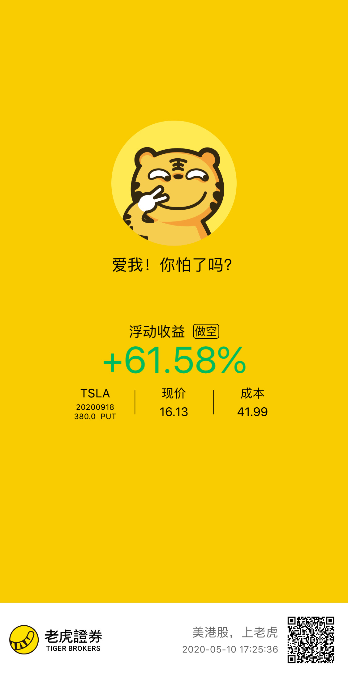 我看了老虎社区里铺天盖地都是分析公司前景,以及模棱两可的市场信息。就像上学的时候,父母总是说你好好学习,肯定会有前途,都是宽泛的道理,我今天分享一下我的实际操作,就是卖出特斯拉的380看跌期权,如果9月特斯拉股票高于380我就赚了全部的权力金,如果低于380我正好抄底。